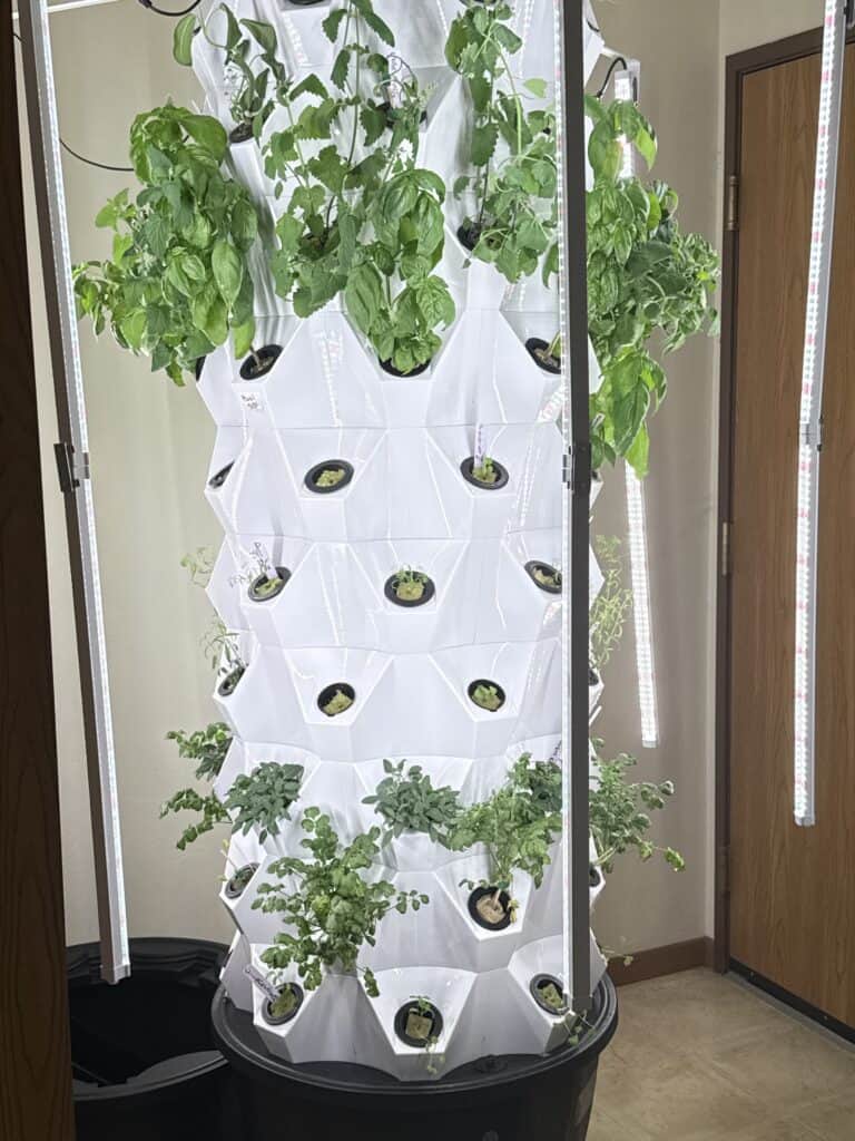 He said the plan is to place the hydroponic tower – which stands more than seven feet tall and supports roughly 80 different plant species – inside a glass enclosure, allowing customers to see the plants growing fresh before purchasing them.